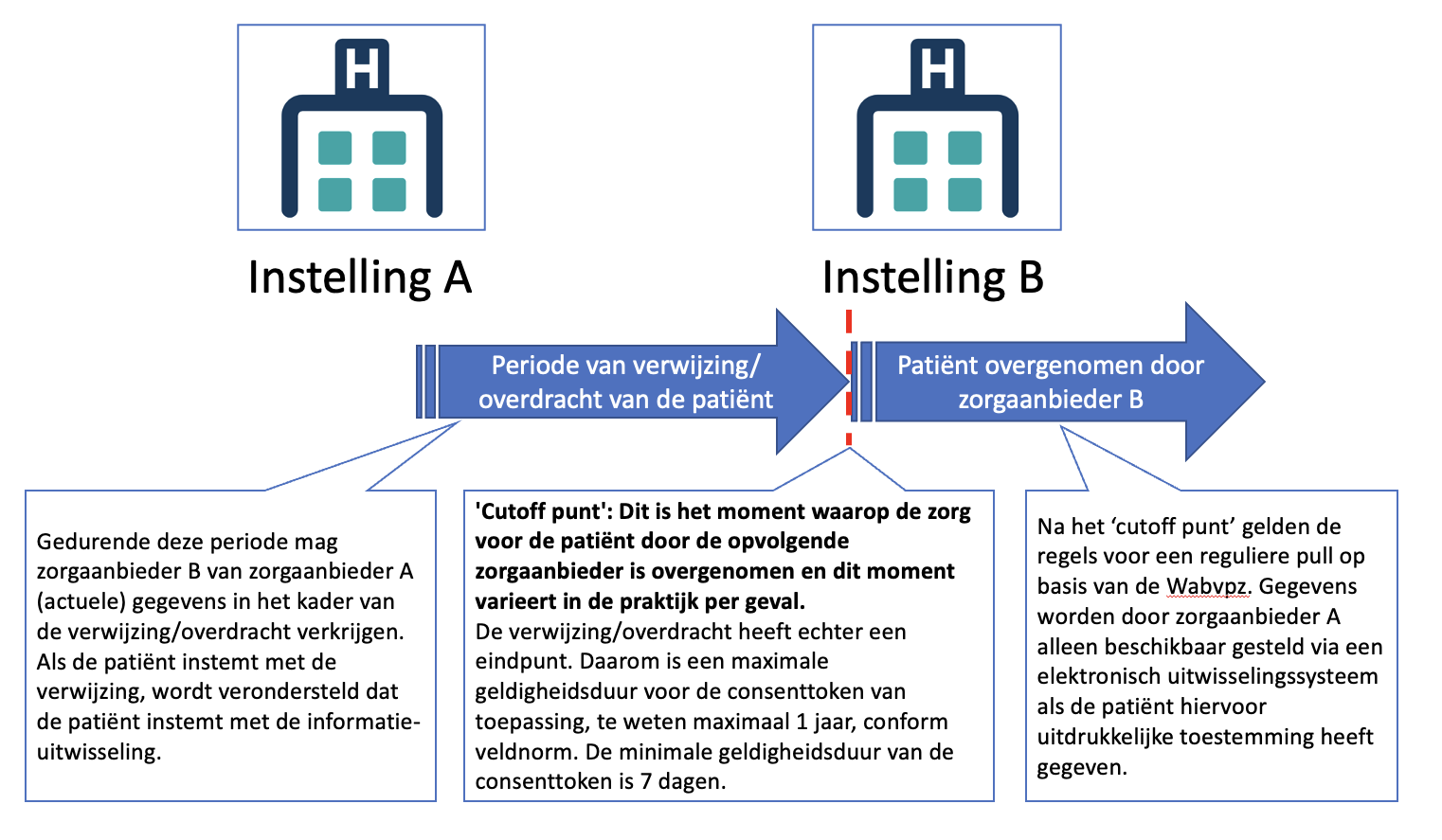Let bij het opvragen van de gegevens op het 'cutoff punt'. Dit is het laatste moment in de tijd waarop nog op basis van de veronderstelde toestemming de informatie mag worden opgevraagd. Daarna is de veronderstelde toestemming niet meer geldig en mag de informatie niet meer worden opgevraagd op basis van die veronderstelde toestemming. Onderstaand plaatje verduidelijkt het 'cutoff punt'.